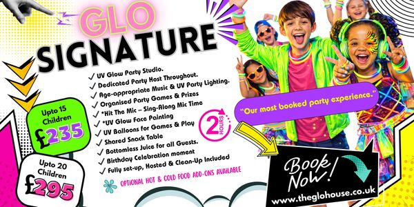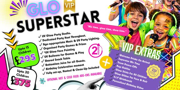 A fully hosted party in our UV Party Studio with extra glow, extra energy, and those wow moments kids love.